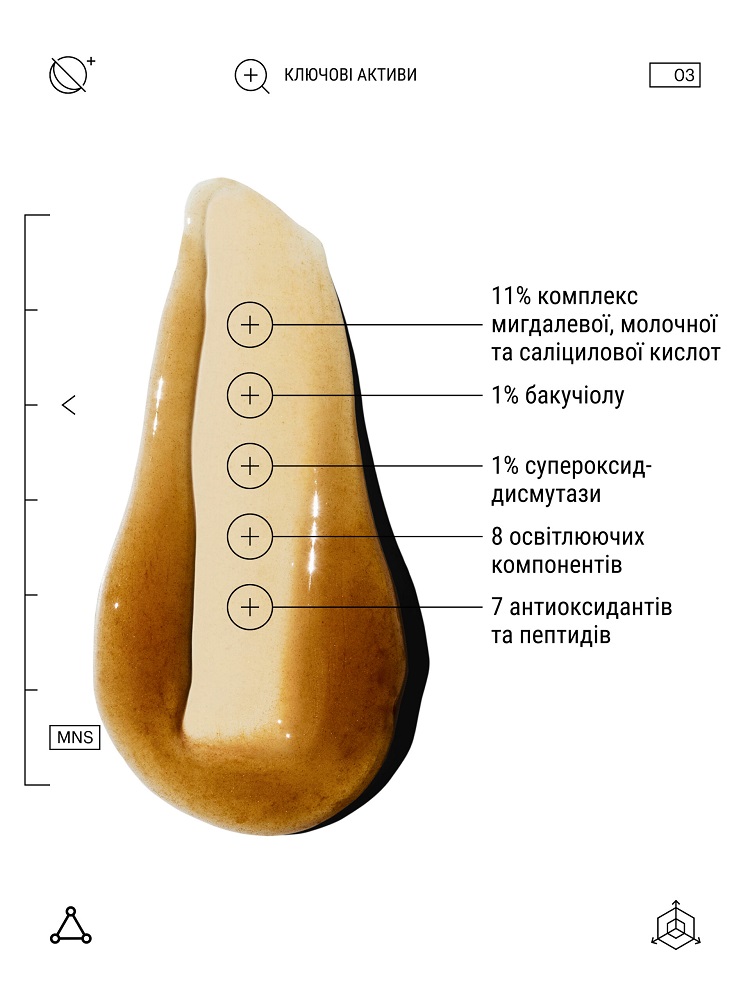 У складі комплекс 11% кислот (мигдалева, молочна та саліцилова), антиоксиданти та пептиди, 1% бакучиол (рослинний аналог ретинолу), 8 освітлювальних компонентів. Завдяки такому складу сироватці під силу впоратися зі стійкою вираженою пігментацією, розширеними порами, запаленнями та акне, нерівномірною текстурою шкіри.